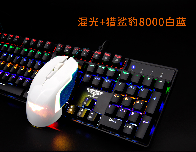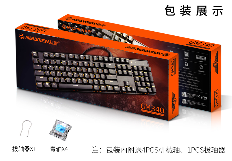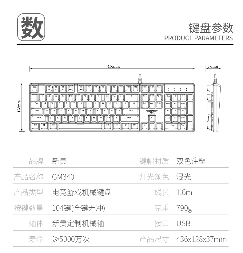 • 商品名称:新贵GM340青轴混光全键无冲机械键盘专业游戏电竞ABS耐磨键帽透光